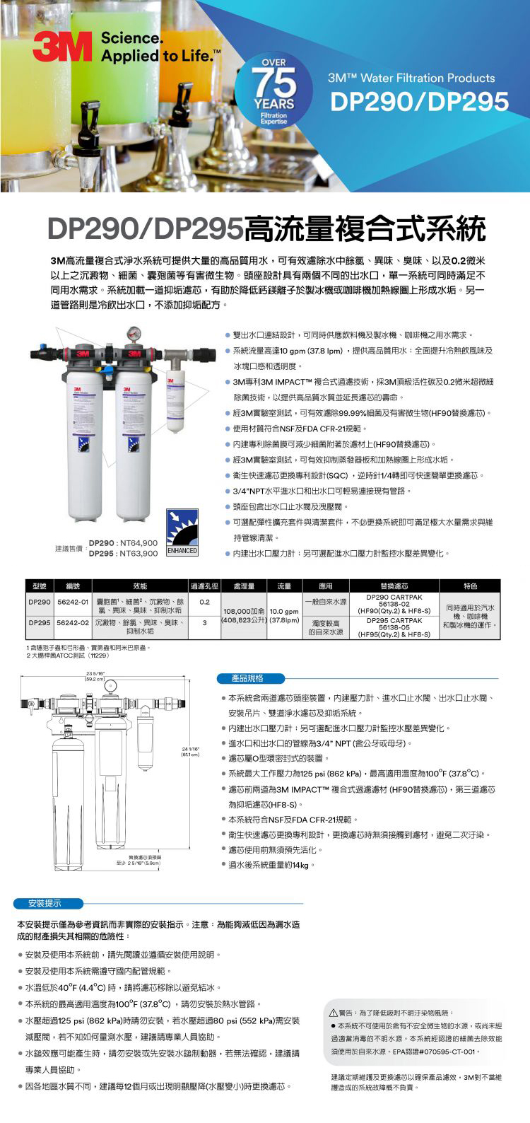◆ 適用水源:DP290適用一般自來水源;DP295適用自來水源濁度較高之地區